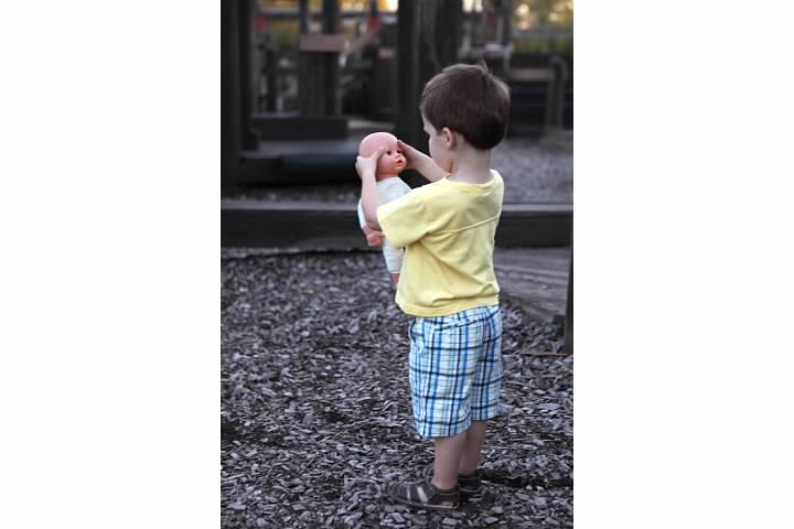 Seriously though, a few years ago, we were at a local park for a family photo shoot, and Gray, two years old at the time, darted off to the playground. Among the wood chips, he found an abandoned doll.