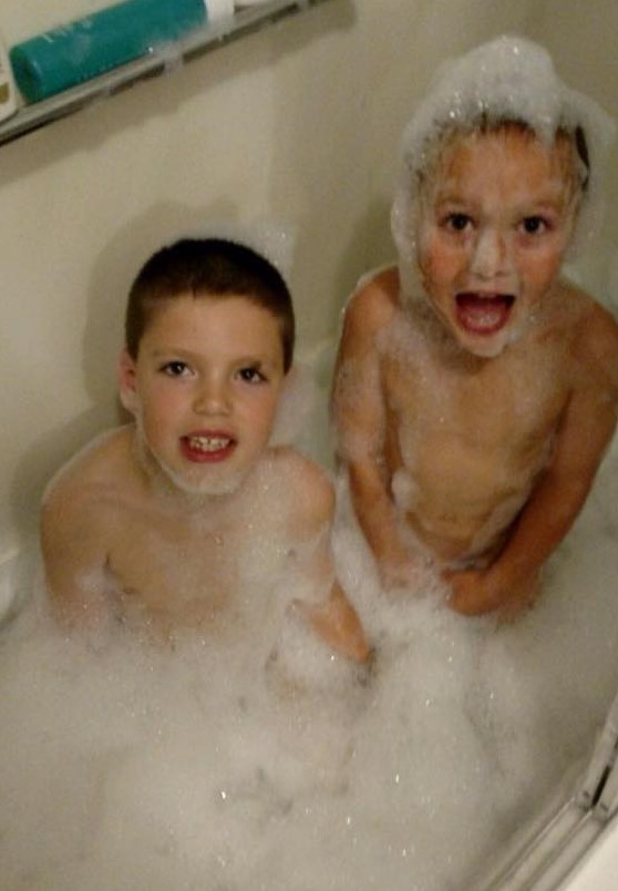 Later that week, when Chad was giving the boys a bath, he slid the glass doors shut so they could splash around. After some suspicious-sounding giggling, Chad opened the door to find that Reed had poured the entire bottle of bubbles in tub.