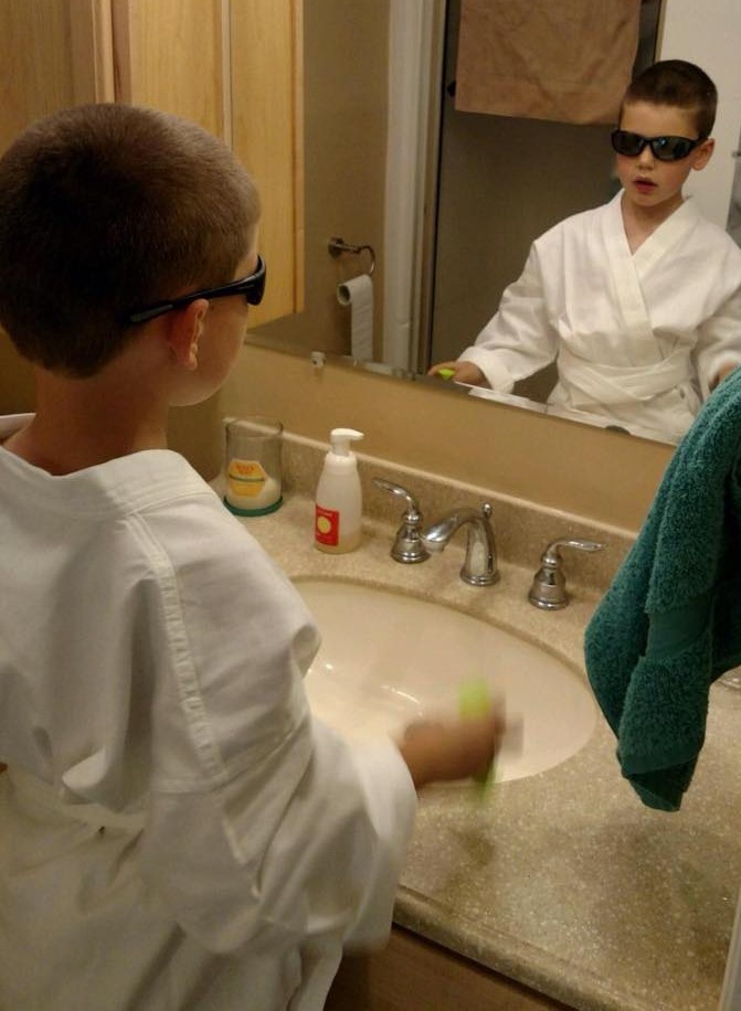 Miles isn’t the only one around here feelin’ like a tough guy. A couple weeks ago, Gray (six years old) was issued his gi uniform for Taekwondo. Later that day, Chad caught him posing in the bathroom mirror: