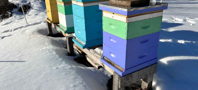 Beekeeping is tricky business. Helping bees through a northern winter requires a dry hive, emergency food (in case they burn through all the honey stores you leave them), and keeping Varroa counts low. The Varroa mite is a parasitic mite that weakens bees and makes them more susceptible to maladies. We use a variety of organically approved treatments to keep Varroa population low spring through fall so bees can go into winter strong. I felt good about these colonies when I applied my last treatment in the fall and added emergency food and pine shavings to control moisture. Mite counts were low and bee populations were solid.